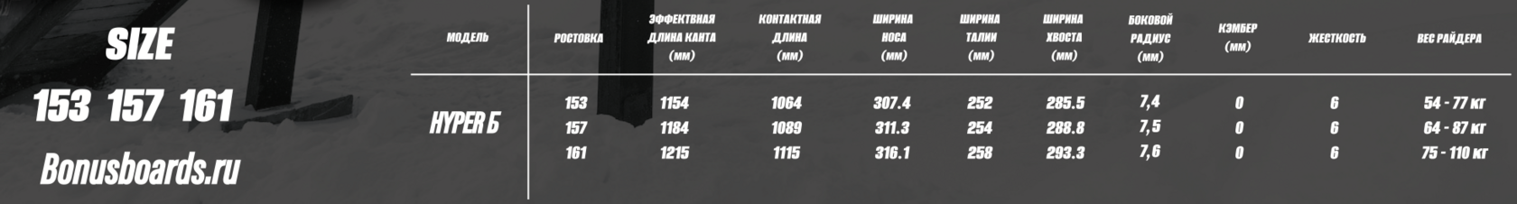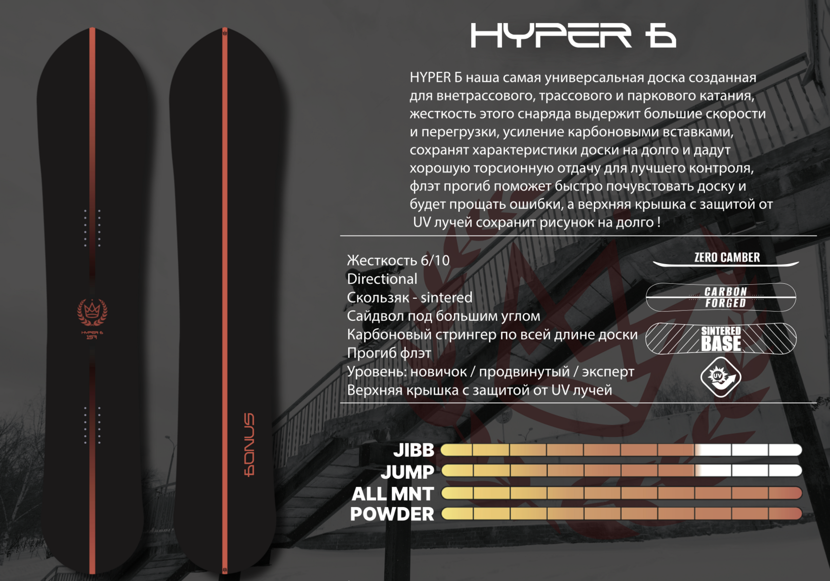 HYPER Б – универсальная модель, созданная для райдеров, которые хотят кататься в любых условиях: внетрассовый фрирайд, подготовленные трассы или парк. Эта доска сочетает устойчивость на высокой скорости, отзывчивость и комфорт, благодаря чему подойдёт как для прогресса новичков, так и для уверенных райдеров. Жёсткость и усиление карбоновым стрингером делают модель надёжной и долговечной, а прогиб Flat помогает быстрее почувствовать доску и прощает ошибки на первых шагах. HYPER Б легко справляется с перегрузками и даёт отличную торсионную отдачу для уверенного контроля в любых условиях.