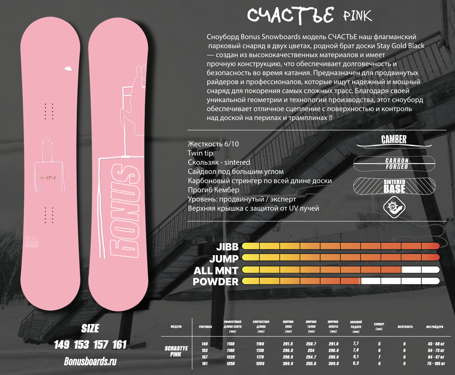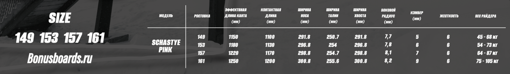 Сноуборд Bonus Snowboards СЧАСТЬЕ розовый - наш флагманский парковый снаряд, созданный для райдеров, которые выбирают стиль, мощь и уверенность на каждом вылете. Эта модель выпускается в двух цветах и считается "родным братом" легендарной доски Stay Gold Black. Доска сделана из высококачественных материалов с усиленной конструкцией, что обеспечивает долговечность и безопасность. Благодаря сбалансированной геометрии и технологии производства, СЧАСТЬЕ дарит отличное сцепление со склоном, стабильность на скорости и максимальный контроль на перилах и трамплинах. Подходит для продвинутых райдеров и экспертов, которым нужен надежный инструмент для катания в парке и уверенных трюков.