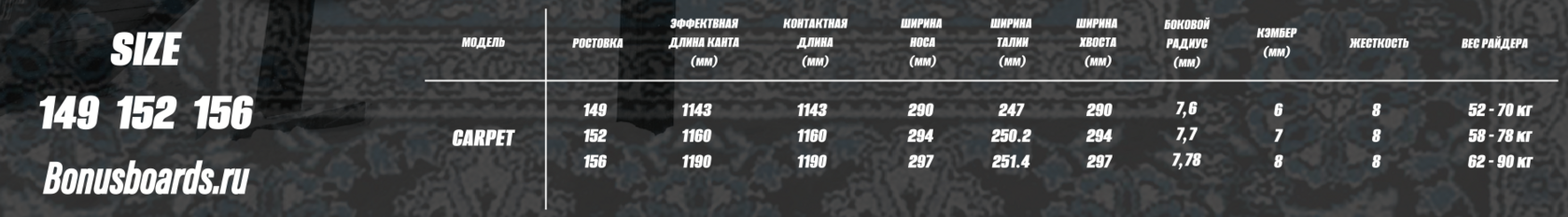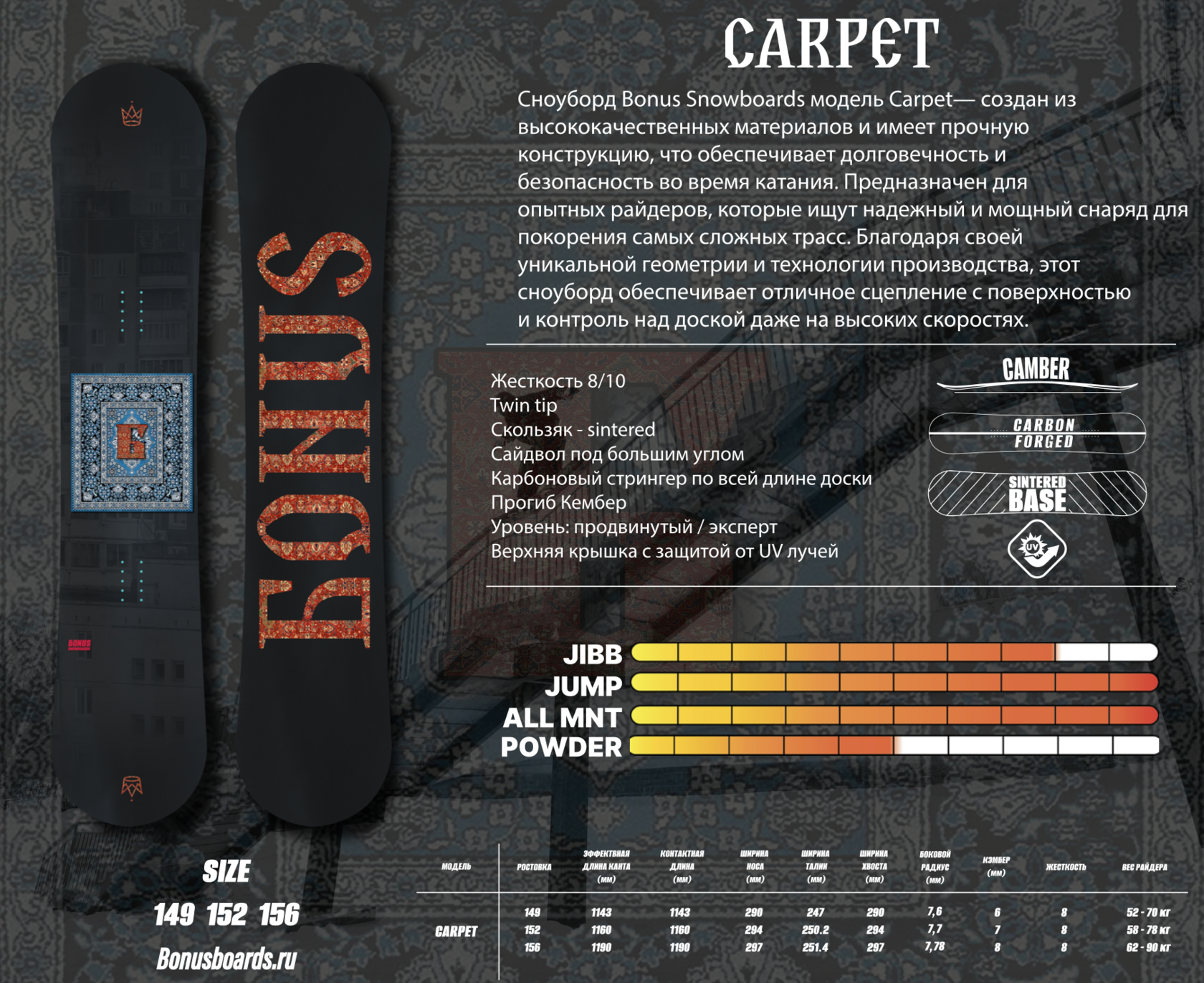 Carpet - мощный и надежный сноуборд для райдеров, которые уверенно чувствуют себя на склоне и ценят стабильность на высоких скоростях. Эта модель создана из высококачественных материалов с прочной конструкцией, что гарантирует долговечность и безопасность. Благодаря своей геометрии и технологии производства, Carpet дарит отличное сцепление с поверхностью и максимальный контроль при агрессивном катании. Подходит для опытных и продвинутых райдеров, которым нужна доска для динамичного фристайла и уверенных линий.
