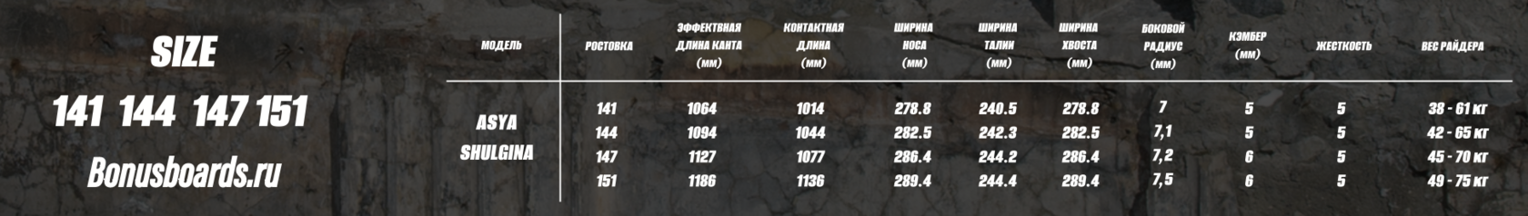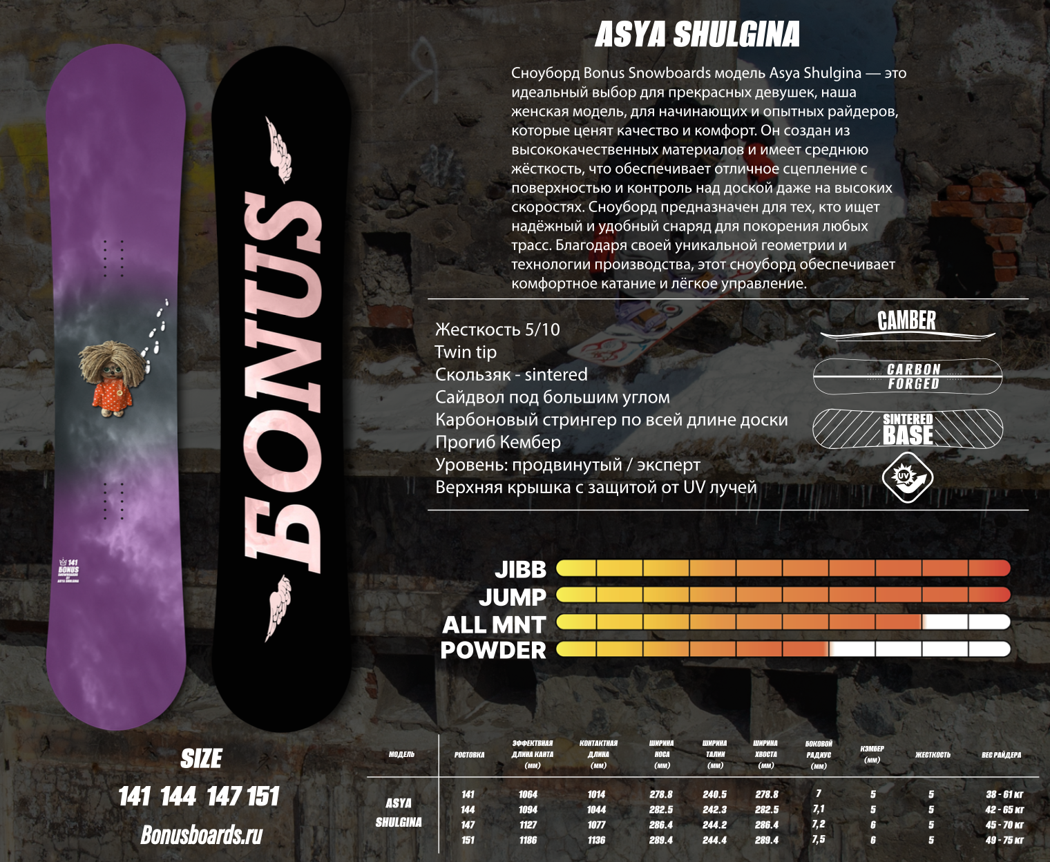 Asya Shulgina - женская модель сноуборда, созданная для райдеров, которые ценят качество, комфорт и уверенность на склоне. Эта доска подойдёт как начинающим, так и более опытным сноубордисткам. Средняя жёсткость обеспечивает баланс между стабильностью и манёвренностью, что делает катание лёгким и комфортным. Сноуборд отлично держит сцепление с поверхностью и позволяет контролировать движение даже на высокой скорости. Благодаря продуманной геометрии и современным технологиям производства, доска идеально подходит для катания по различным трассам.